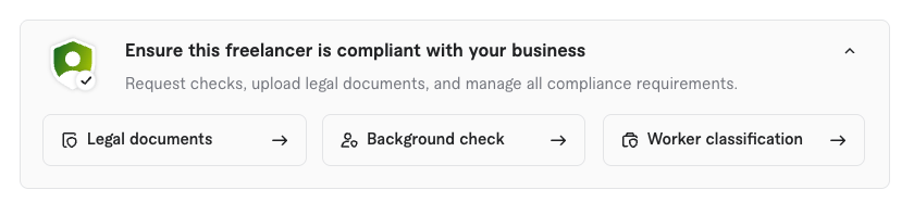 First-time users: Go to the freelancer's profile or Inbox, click the "Ensure this freelancer is compliant with your business banner," then select "Legal documents."
