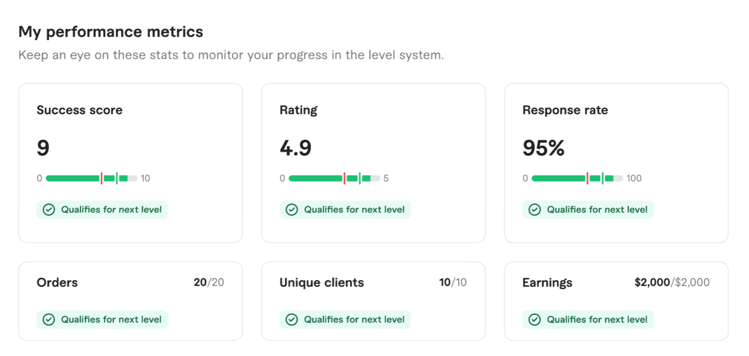 - Para quién es: Todos los freelancers en Fiverr. Tu nivel es visible para los clientes en las tarjetas de servicios, las páginas de servicios y en tu perfil de freelancer.