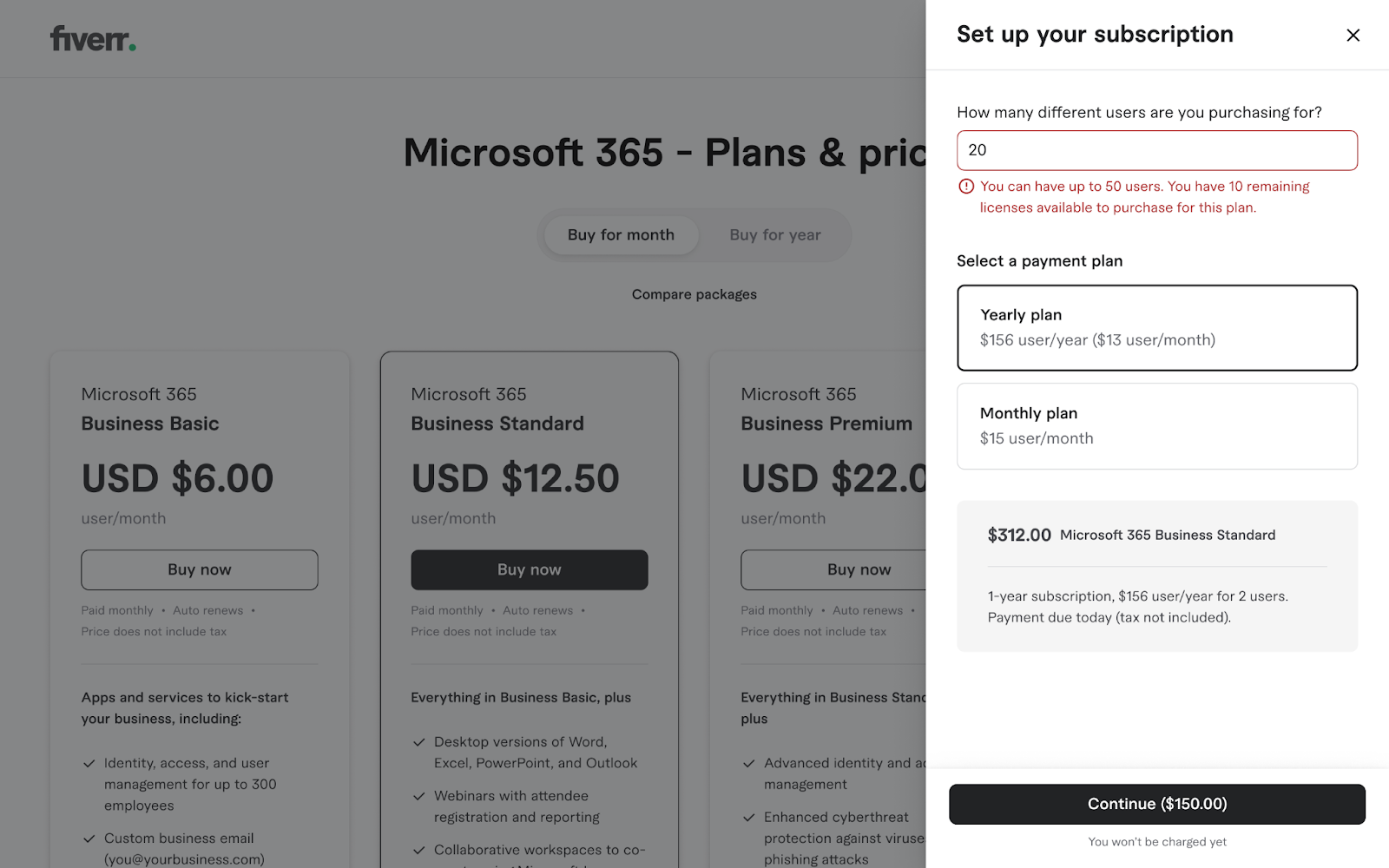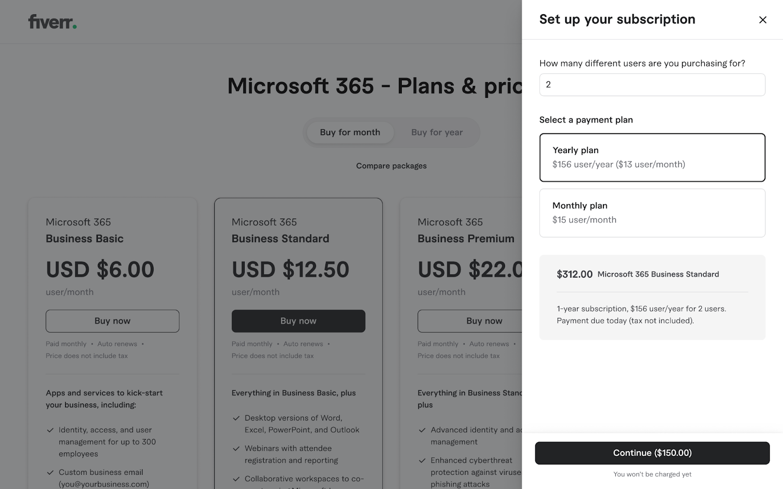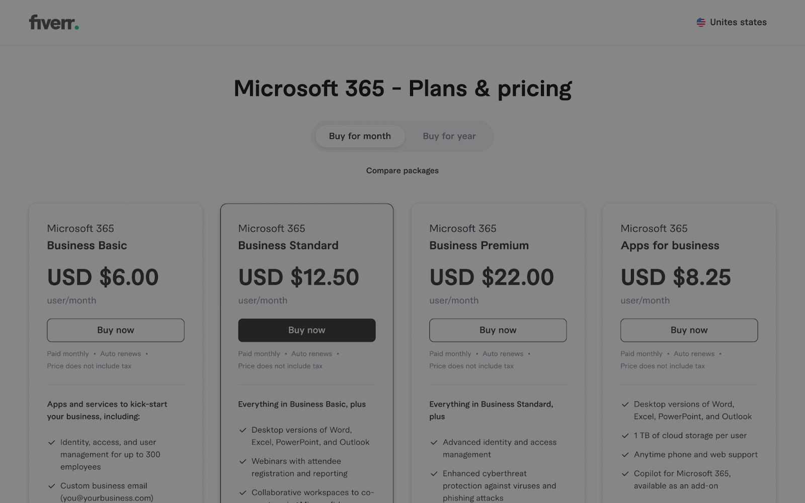 - Abre el enlace proporcionado por el freelancer, que te dirigirá a la página de planes de Microsoft 365 en Fiverr.